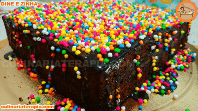 Bolo de Chocolate Rápido e Fácil Gigante, delicioso muito úmido com cobertura cremosa de brigadeiro mole e bastante chocolate granulado.